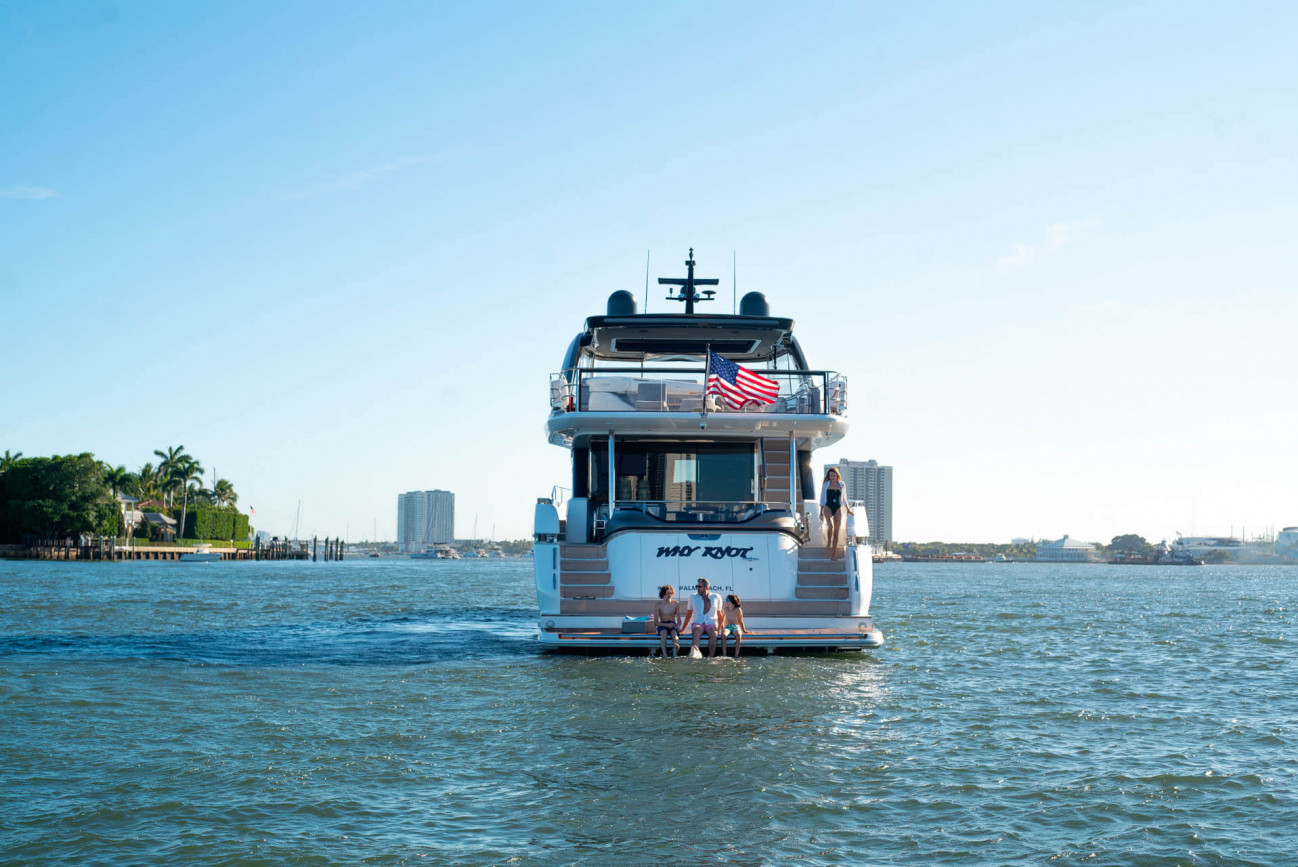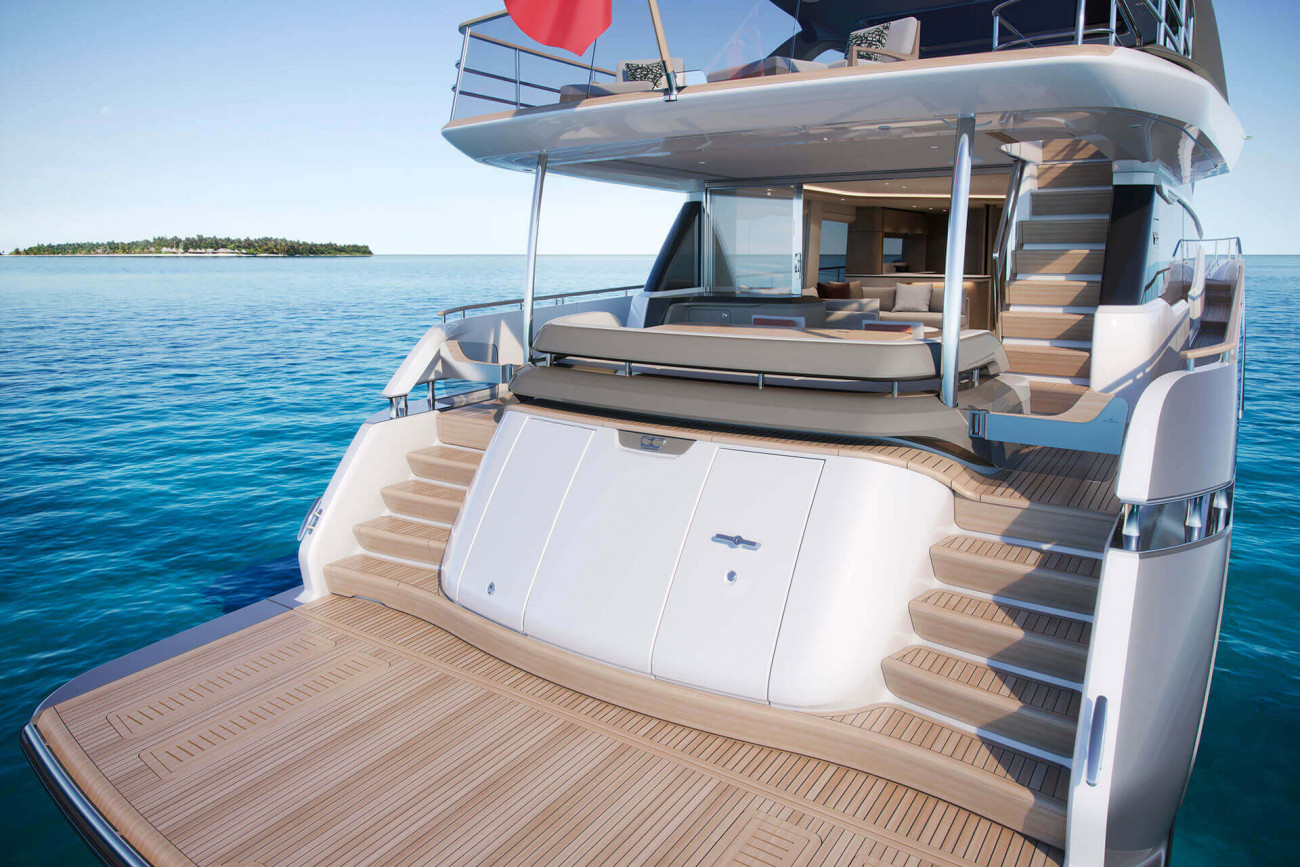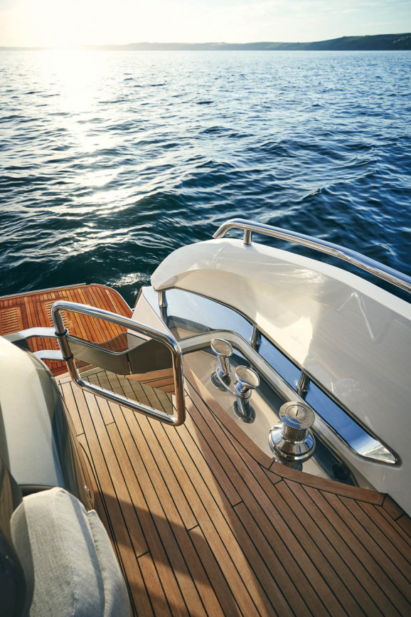 • Teak-laid transom platform, cockpit deck, flybridge, flybridge stairway, side decks and foredeck walkthrough