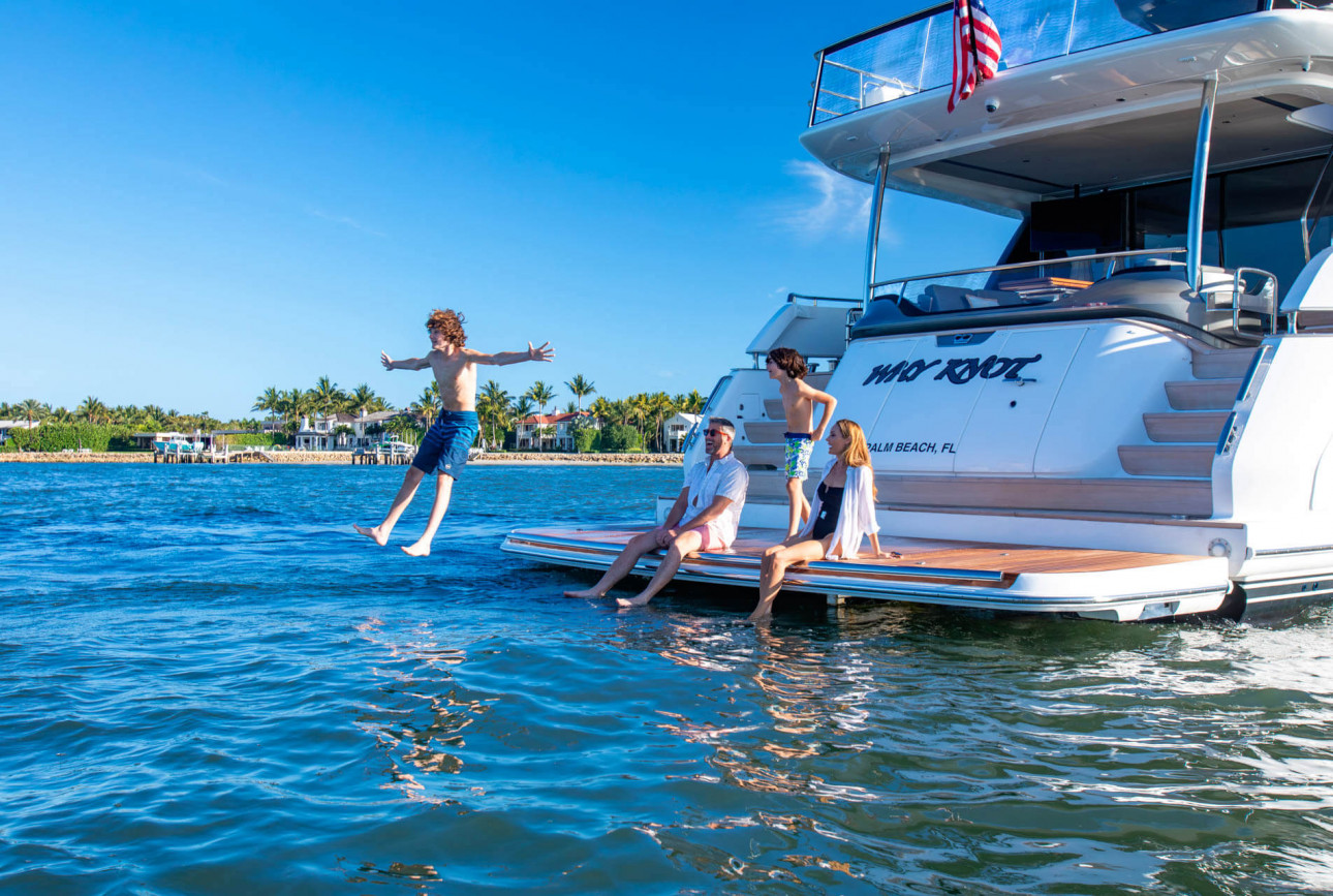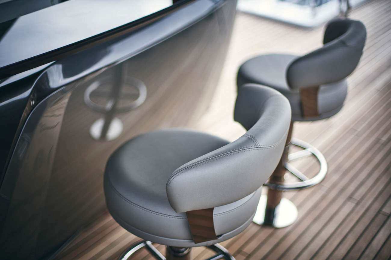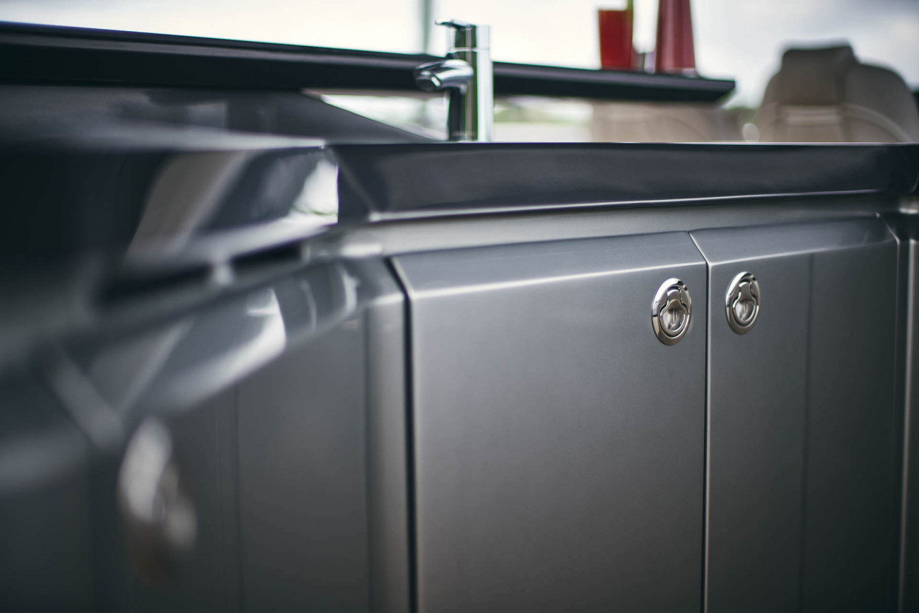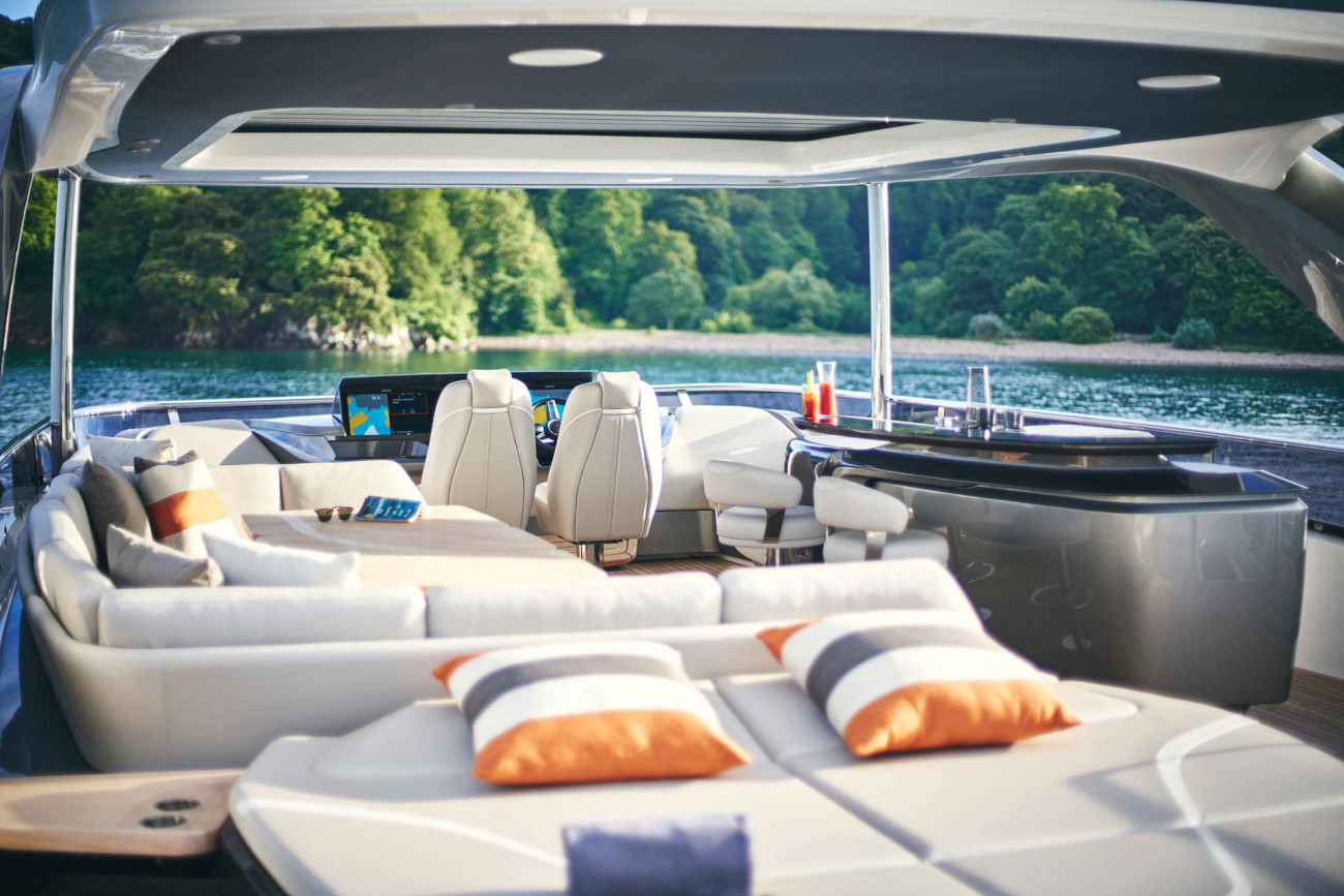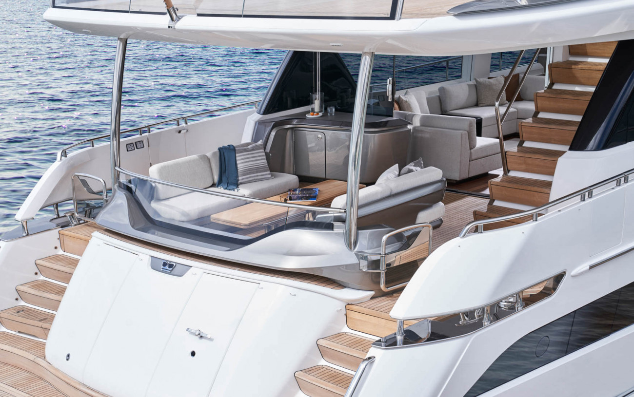 • Twin transom gates leading to bathing platform with electro-hydraulic raise/lower mechanism, foldaway swimming ladder, hot and cold shower