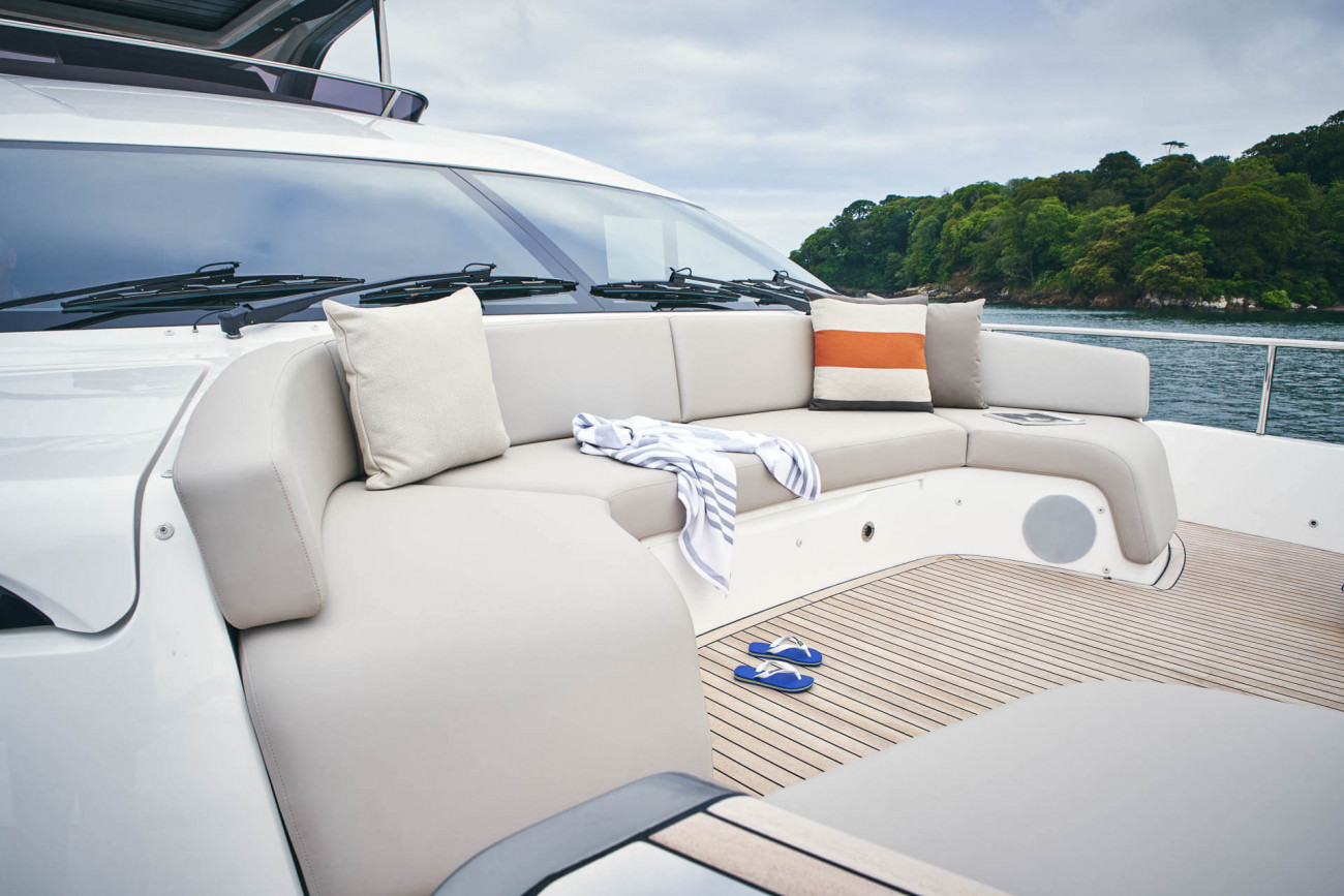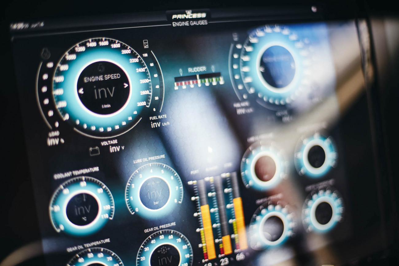 † Fart och räckvidd är uppskattade på en båt med standardutrustning och varierar beroende på skrovets renhet, akterdrevets skick, last, vatten- och lufttemperaturer, sjöförhållanden och andra faktorer. Uppskattningar ges därför i god tro men utan garanti eller några förpliktelser oss oss eller Princess Yachts Limited.