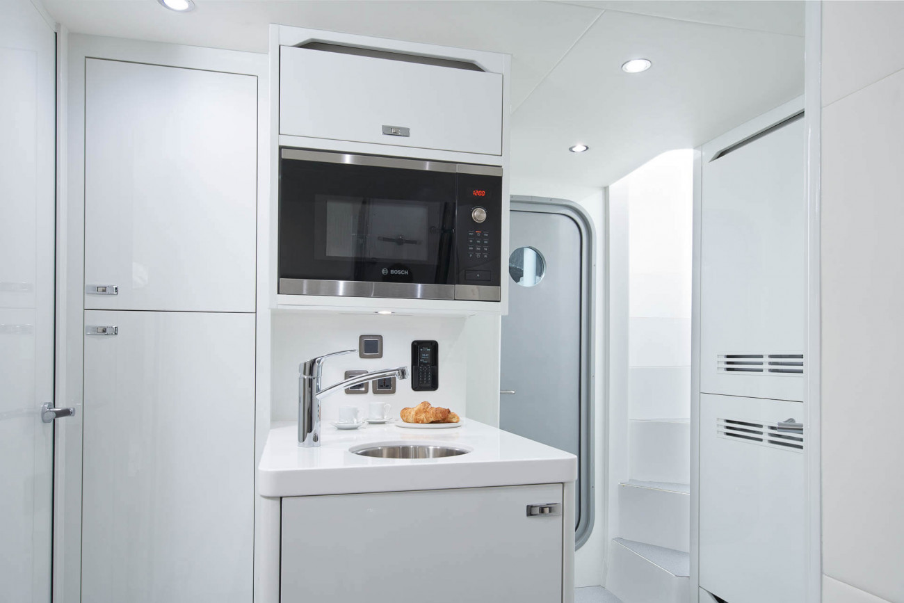 • Crew mess with microwave oven, sink, refrigerator and washing machine with separate dryer