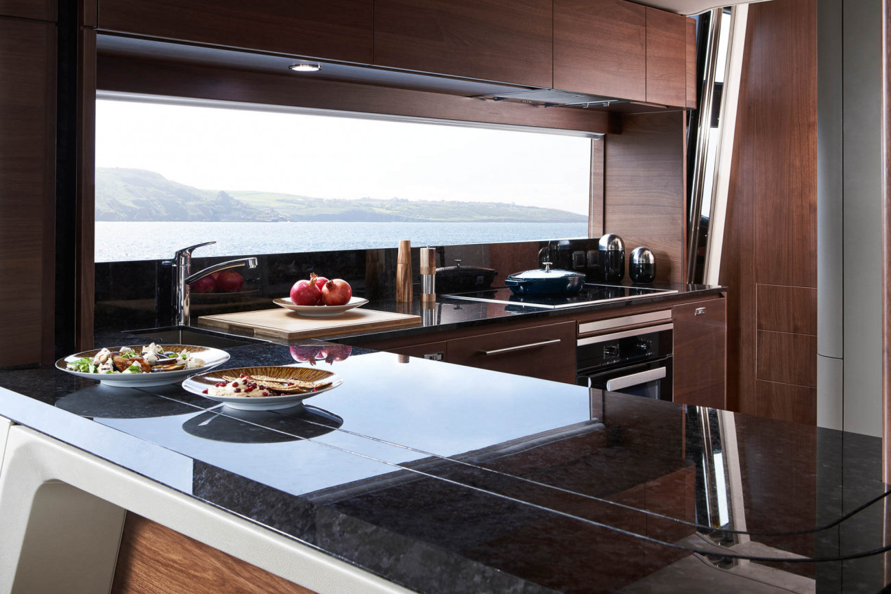• Twin reversible hydraulic anchor winches with foredeck, main helm and flybridge controls